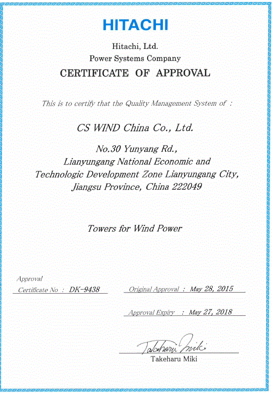 繼2015年5月底審核之后,6月16日,我公司正式獲得日立電力塔架供應(yīng)商認(rèn)證。此次認(rèn)證是對(duì)我公司上半年工作的極大肯定,同時(shí)也是重山風(fēng)力集團(tuán)與日立電氣在全球范圍內(nèi)全面展開合作邁下的堅(jiān)實(shí)一步。